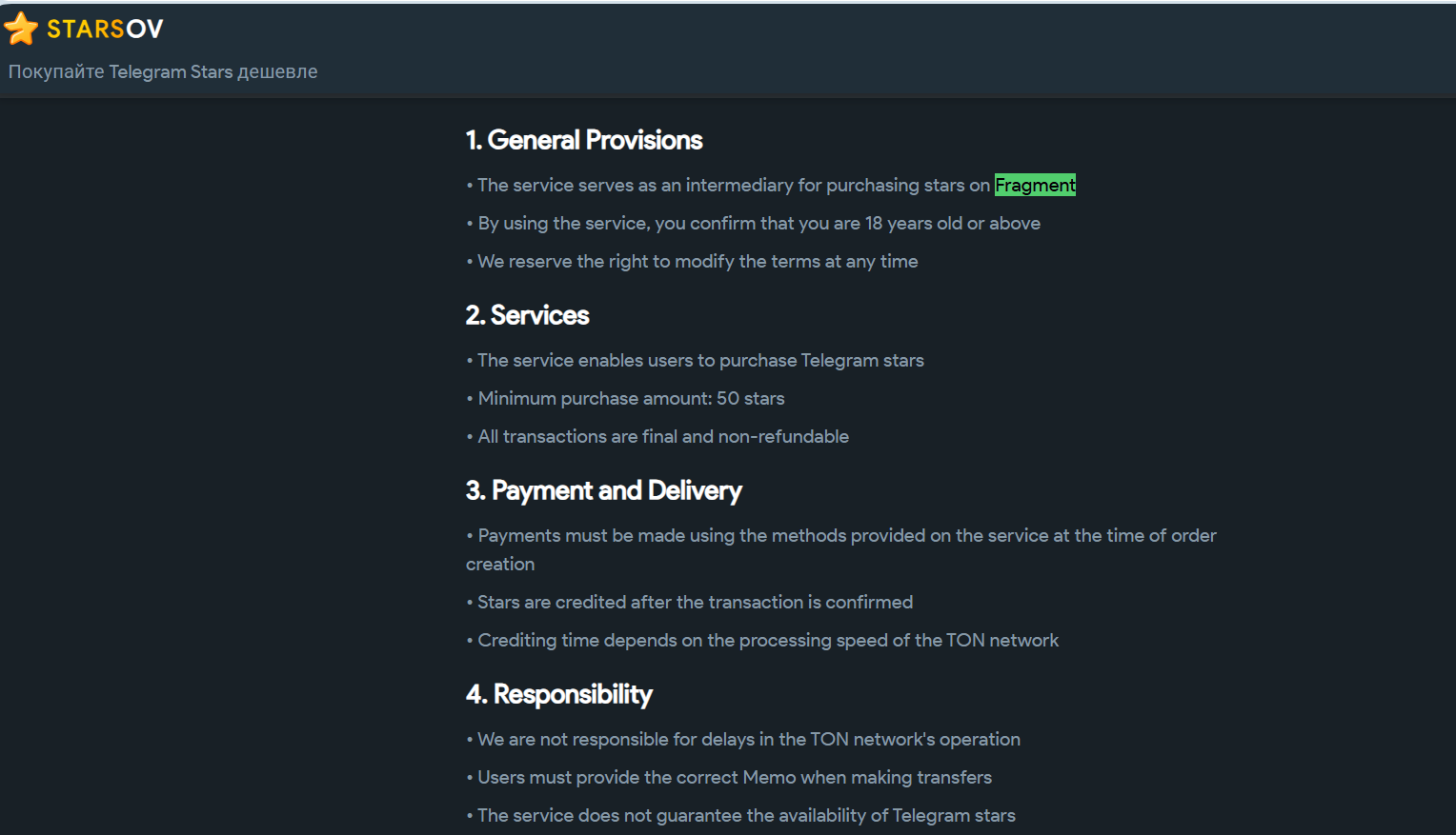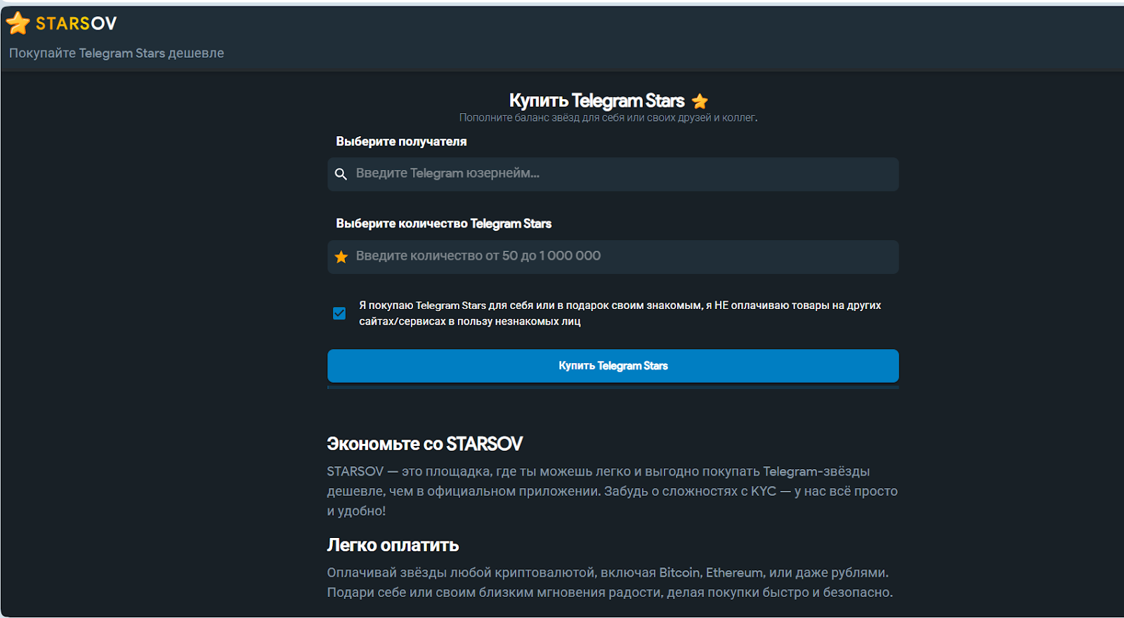 Параллельно с ботами у проекта есть сайт starsovcom, где предлагается покупать звезды дешевле, чем в официальном приложении тг. На сайте указано, что сервис выступает посредником и покупает звезды на Fragment, а пользователь платит удобным способом — картой, криптовалютой или другими методами. Минимальная покупка 50 звезд.