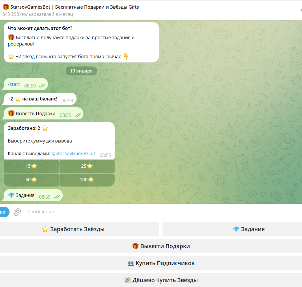 С точки зрения механики все просто. Пользователь зарабатывает звезды, выбирает сумму для вывода, отправляет заявку, после чего в канале появляется сообщение, что подарок отправлен.