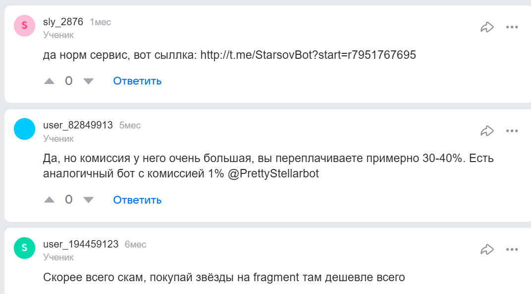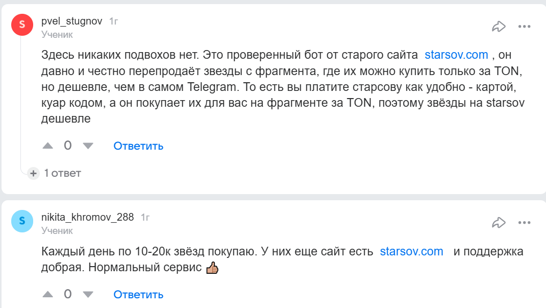 В тг и на форумах мнения расходятся. Часть пользователей пишет, что покупали звезды — все пришло, сервис рабочий. Другие называют проект скамом, указывают на высокие комиссии, отсутствие прозрачности и подозрительно “живые” положительные отзывы со скриншотами.