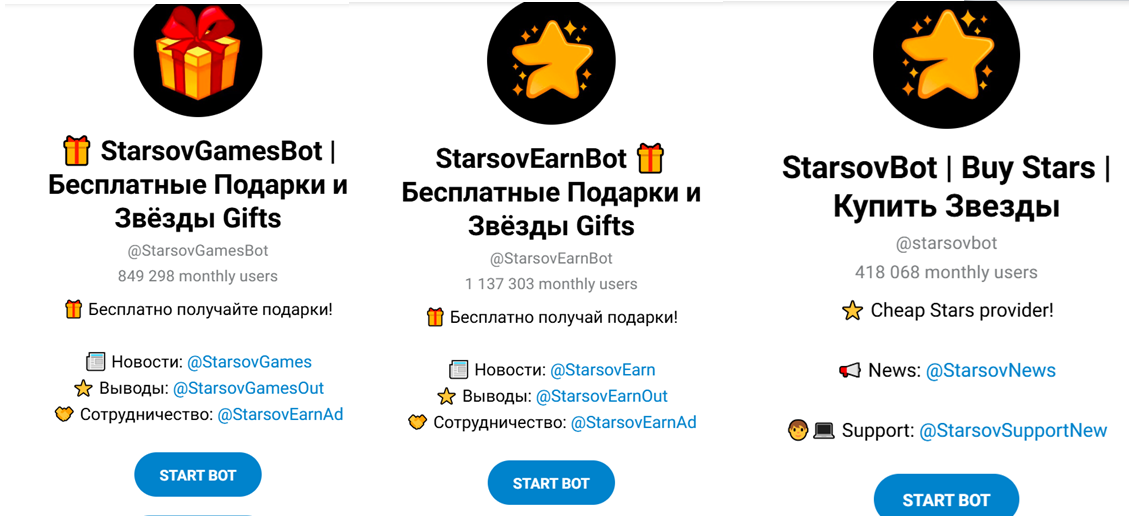 Помимо этого бота, в тг встречаются и другие с похожими названиями: StarsovEarnBot, предлагающий заработок звезд, StarsovEarnAd, StarsovEarnBot и StarsovBot, через которые можно купить звезды напрямую.