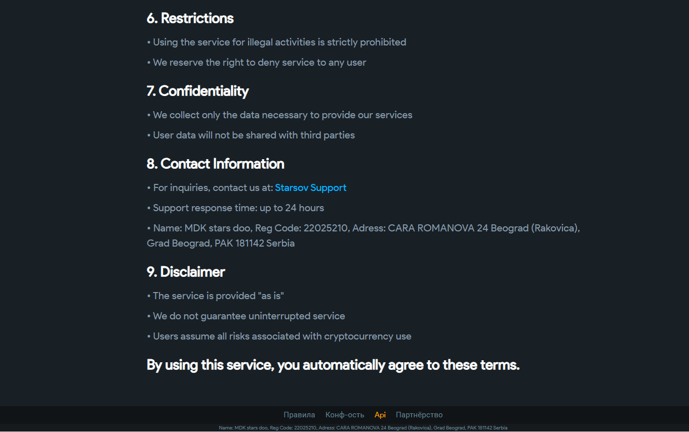 Формально на сайте есть правила, политика конфиденциальности и условия возврата, а также указано юридическое лицо MDK stars doo, зарегистрированное в Сербии, с адресом в Белграде.Отдельная тема это комиссии. Среди нейтральных и положительных комментариев на форумах часто всплывает мысль, что сервис берет высокий процент, по ощущениям 30-40% переплаты по сравнению с альтернативами или официальным Fragment.
