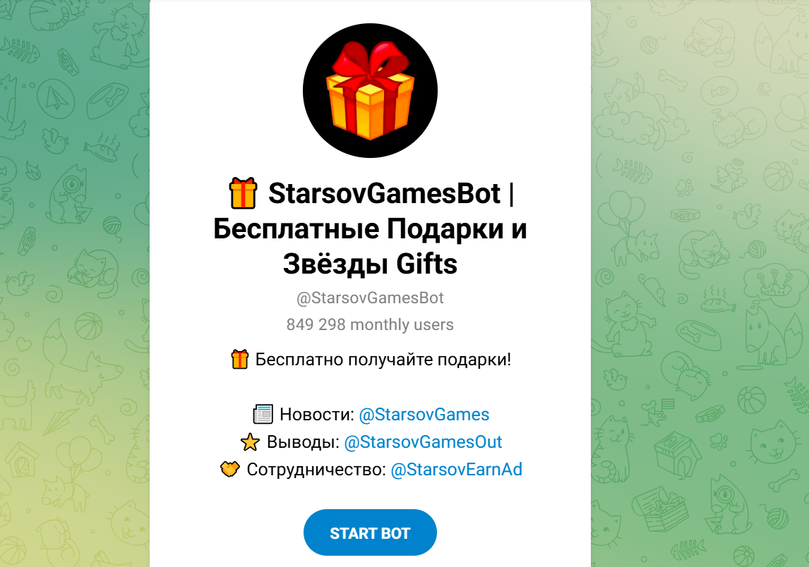 StarsovGamesBot — это тг бот, через который пользователям предлагают бесплатно зарабатывать и получать в телеграмм так называемые “звезды” и виртуальные подарки, выполняя простые задания, приглашая друзей и накапливая звезды с последующим выводом через отдельный канал.