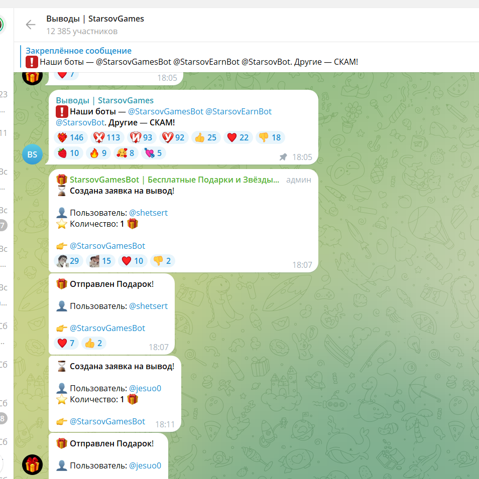 Канал с выводами насчитывает 12К участников, онлайн — более 2К, и там идет постоянная лента сообщений о создании заявок и отправке подарков.
