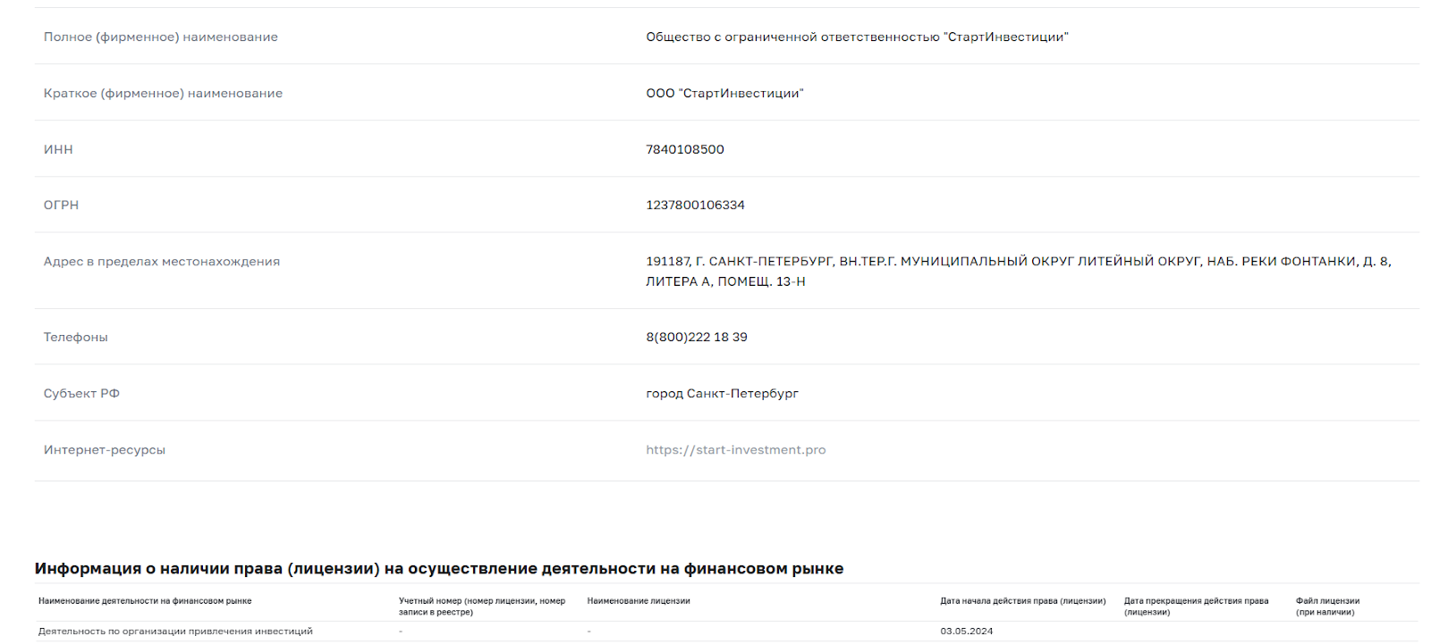 Старт Инвестиции основал некий Артур Садретдинов, но директором значится Александр Барков. Фотографии всей команды представлены на сайте. Офис расположен в Санкт-Петербурге, есть и другие контакты — номер телефона, электронная почта, Телеграмм, WhatsApp. Компания работает как ООО СтартИнвестиции, получила лицензию Центрального Банка России в мае 2024 года, согласно которой может оказывать услуги по привлечению инвестиций, чем она и занимается.