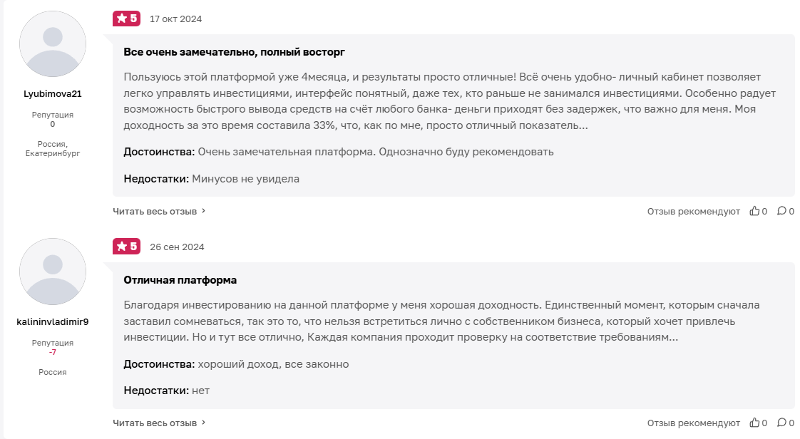Минус есть и очень явный — у Start Investment отсутствует верифицированная статистика доходности проектов. Если у вас есть опыт работы с данной платформой, поделитесь своими результатами вложений в комментариях.