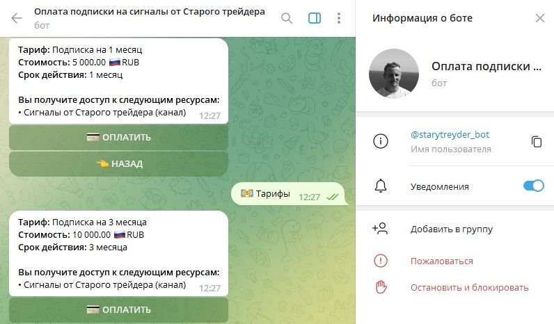 Еще один канал называется Старый Трейдер на Мосбирже. Он был запущен год назад и пока владеет скромной аудиторией в 6 тысяч подписчиков. В Телеграм Старый Трейдер на Мосбирже Владимир освещает новости российской экономики, проводит опросы по предстоящему открытию недели, дает свои комментарии относительно рыночной ситуации. Из платных услуг есть закрытый клуб, в котором есть и обучение, и сигналы. Оплата производится через starytreyder_bot в ТГ. Стоимость на месяц составляет 6000 рублей. Если покупать подписку на квартал, то она обойдется всего в 12 тысяч. Купить отдельно сигналы в ТГ Владимира Карасева можно за 5000 рублей в месяц, что несколько обесценивает обучающие материалы наставника.
