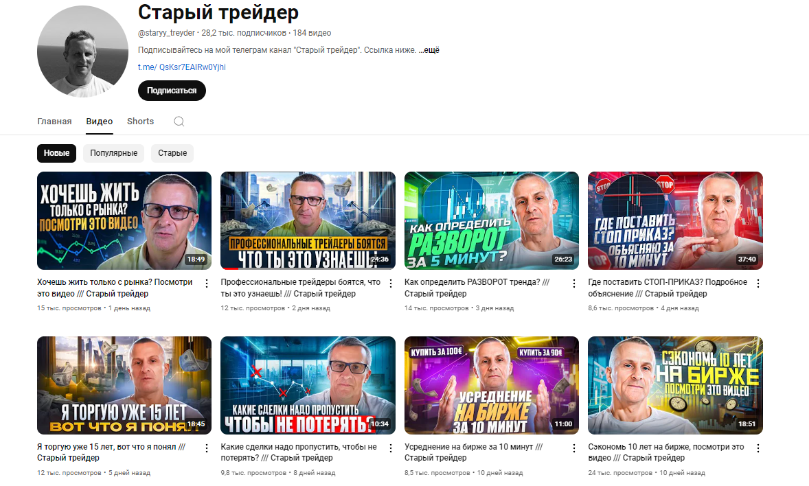 Владимир развивает социальные сети с 2022 года. ТГ Старый Трейдер владеет аудиторией около 48 тысяч подписчиков, активность проявляет около 30%, комментарии скрыты, вовлеченность публики почти 3,5%. Последнее время контент staryy_treyder20 выходит преимущественно в видео формате. По вопросам рекламы оставлен контакт filippkarasev1. Ютуб Старый Трейдер собрал более 28 тысяч подписчиков. Контент разделен на следующие категории: