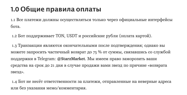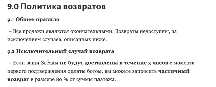 Если же бот провел подтверждение, то возврат делать просто отказываются. При этом в случае, если через 3 часа после оплаты на баланс аккаунта не пришли звезды, то пользователю тоже доступен частичный возврат. Только создатели бота, которые не выполнили свои обязательства по переводу звезд, еще и удержат 20% от суммы платежа.