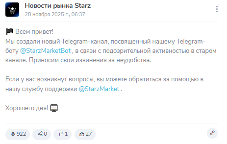 Новостной Телеграм-бот Новости рынка Starz запустили в конце ноября 2025 года. При этом создатели канала рассказывают о том, что канал создали из-за подозрительной активности на старом канале. Таким образом, можно сделать вывод, что бота запустили еще раньше.