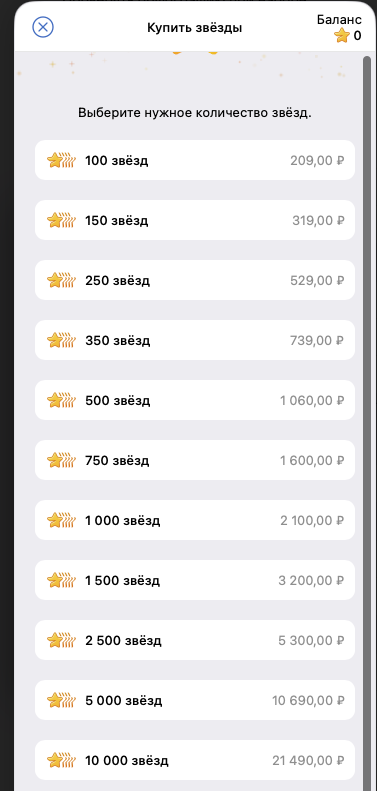 А напрямую в Телеграм такое количество звезд стоит 21 490 рублей: