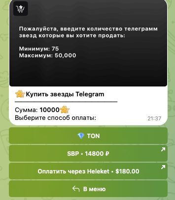 Что же касается цен, то стоимость звезд действительно значительно ниже, чем при прямой покупке, Например, за 10к звезд просят 14 800 рублей в боте: