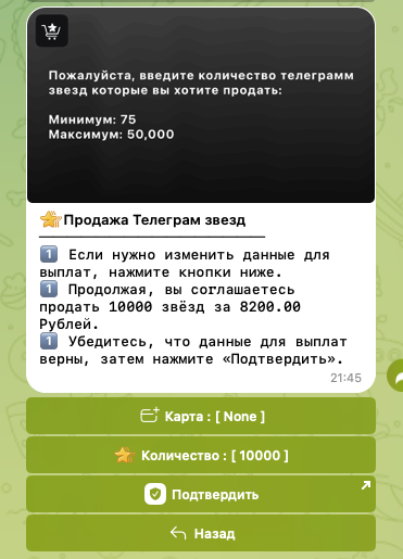 Продажа Телеграм-звезд доступна в обмен на крипту или рубли. В таком случае стоимость все тех же 10к звезд составит всего 8 200 рублей – почти в 2 раза дешевле, чем при покупке.