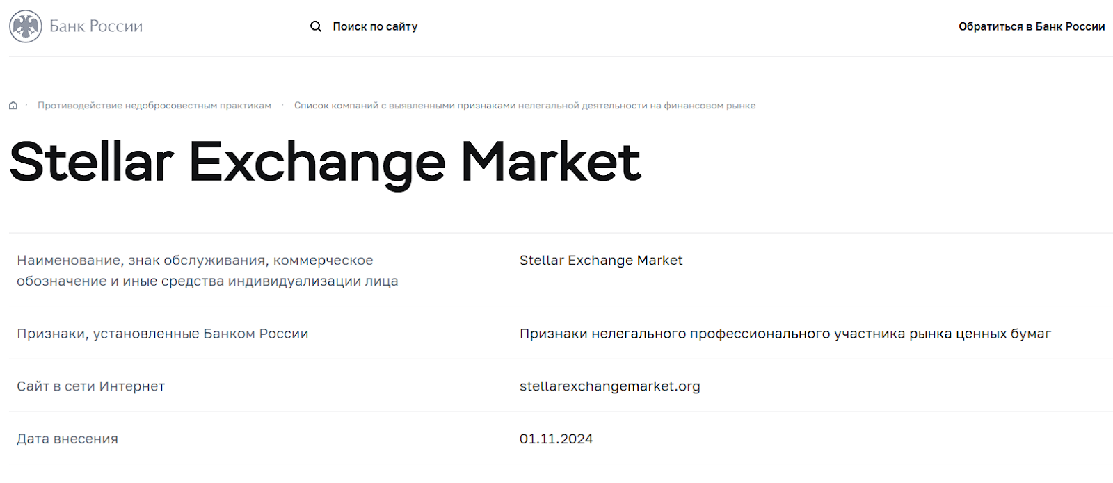 Важно. В ноябре 2024 года компания StellarExchangeMarket org была внесена в черный список ЦБ РФ. Представители Центробанка выявили в деятельности сервиса признаки нелегального профессионального участника рынка ценных бумаг.