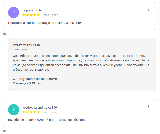 Мнения о SBS cash только лишь положительные. Довольные пользователи отмечают быстрые переводы и простоту сервиса. Но стоит учитывать, что обменник проводит акции с бонусами за отзывы. Так что это может сильно влиять на объективность оценок.