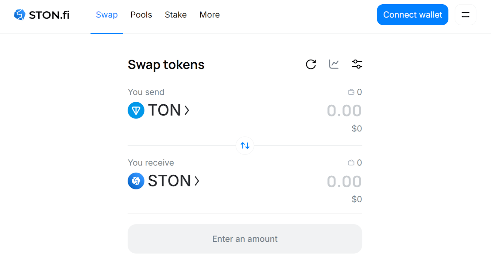 Работа ведется через сайт app ston fi или приложение биржи. Именно здесь доступны такие разделы, как SWAP для обмена, Pools для обеспечения ликвидности, Stake для пассивного заработка на стейкинге и другие.