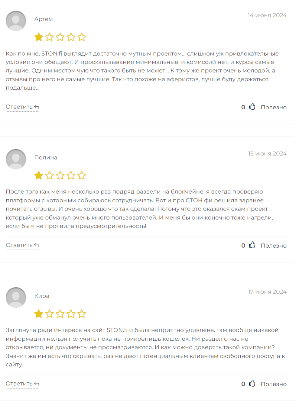 Встречаются и негативные комментарии о Стон Фи. Некоторые пользователи называют его мутным проектом из-за слишком привлекательных условий. Также отмечается чрезмерная молодость биржи и дефицит информации без привязки кошелька.