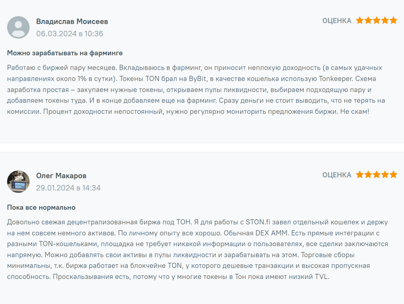 Отдельное внимание стоит уделить отзывам о Ston Fi, которые многое могут рассказать о проекте и его потенциале. Из позитивного пользователи отмечают возможность заработка на фарминге и неплохую доходность, прямую интеграцию с разными кошельками ТОН и возможность работы без верификации.