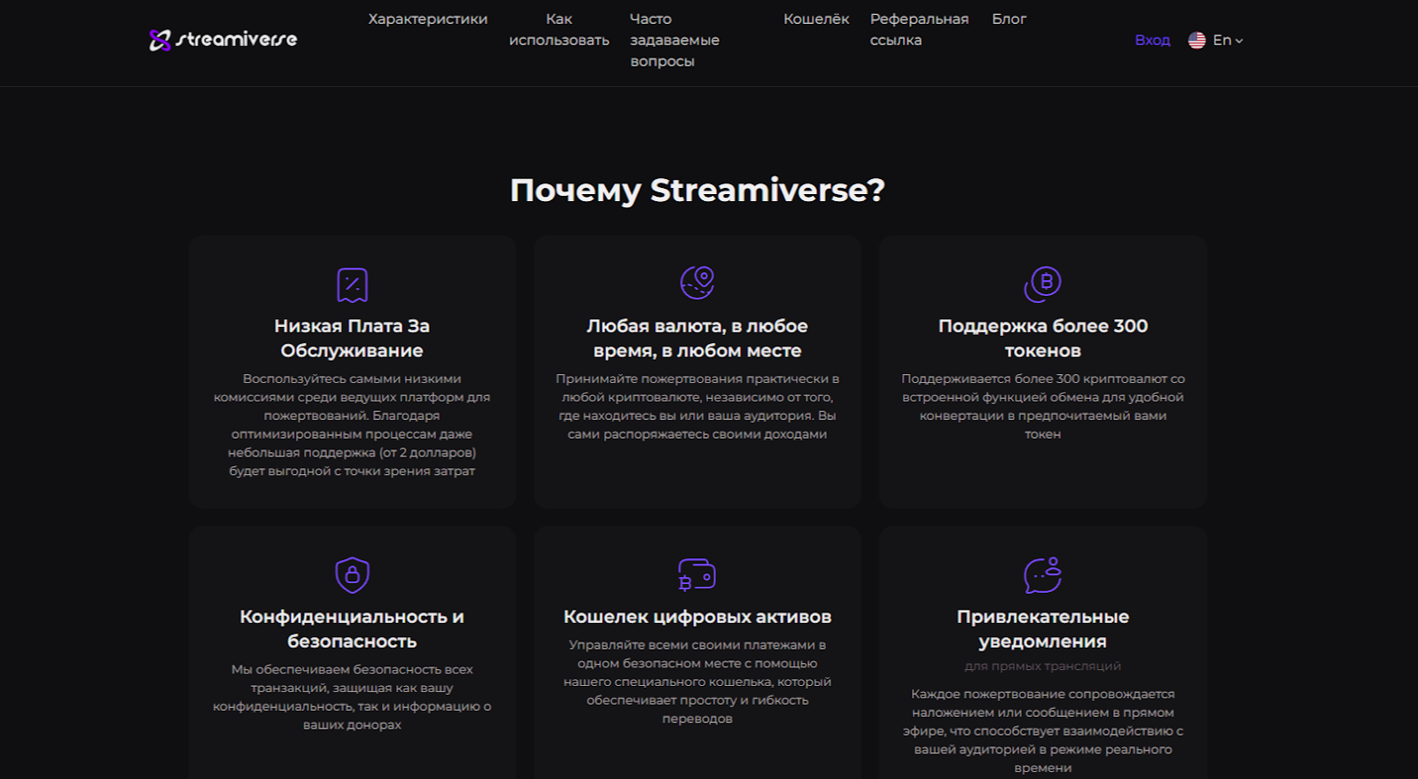 Дизайн сайта выполнен в стиле современного минимализма с ориентацией на функциональность и удобство. Интерфейс портала разработан с учетом потребностей стримеров и контент-мейкеров. В шапке ресурса размещены разделы «Характеристики», «Как пользоваться», «Часто задаваемые вопросы», «Кошелек», «Реферальная ссылка», «Блог». Футер содержит ссылки на условия использования и политику конфиденциальности. Ни в одном из разделов веб-сайта нет ни намека на юрлицо и документы, обеспечивающие пользователям определенные гарантии.