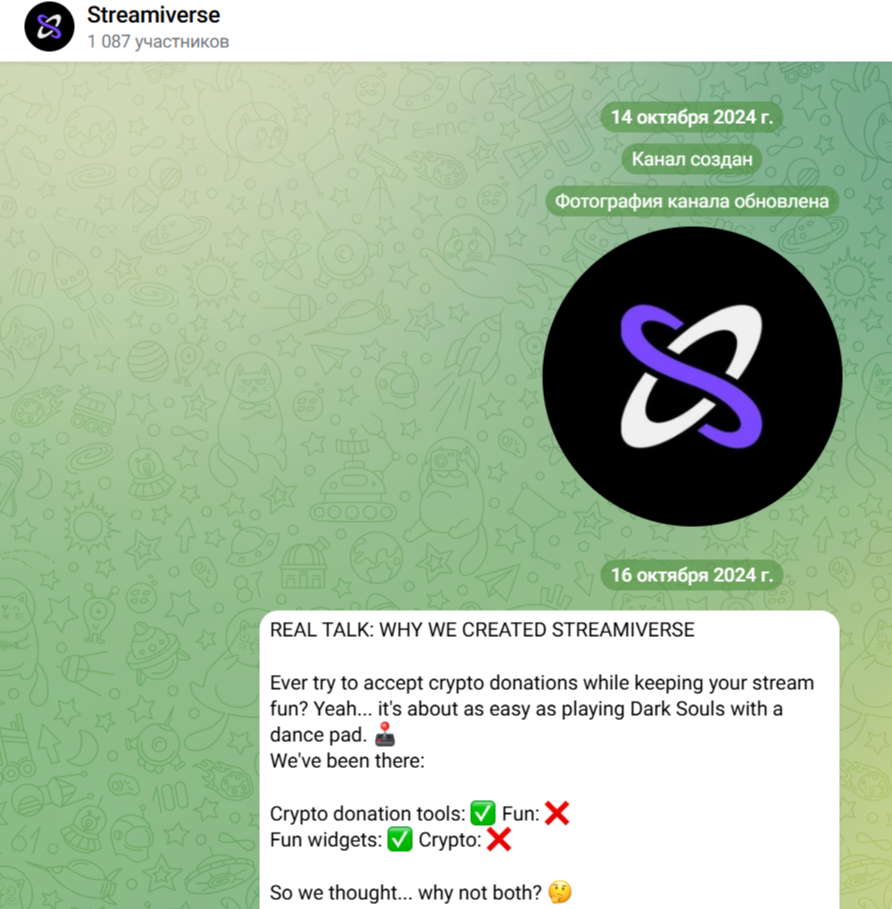 Продвижением услуг инвестиционной платформы владельцы занимаются в Инстаграме. Есть канал Streamiverse и в Телеграме. Данный проект появился в мессенджере 14 октября 2024 года. Он имеет 1 000+ подписчиков. В ленте канала размещаются новости, связанные с экосистемой платформы. Публикации интересны 3% пользователей. Тонкий намек на накрутку ботами.