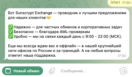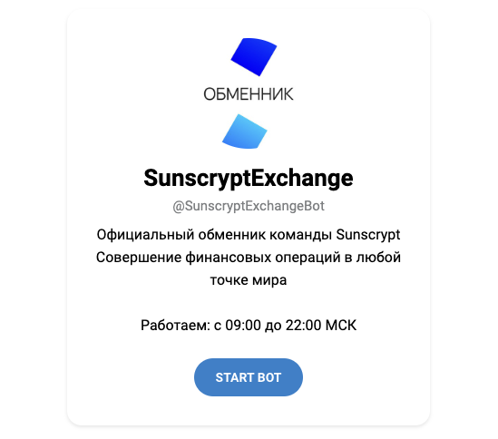 «Сан Скрипт Эксчендж» — это не совсем обычный обменник. В отличие от привычных сервисов, данный работает через бота SunScrypt Exchange.