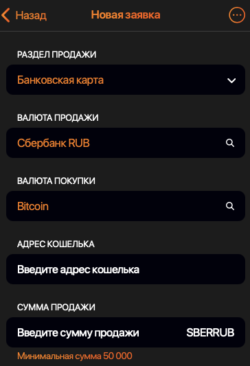 На отобразившейся странице потребуется сначала выбрать платежный метод, при помощи которого будет оплачена заявка. Затем нужно указать валюты покупки и продажи. Ниже потребуется указать платежные реквизиты и сумму обмена.