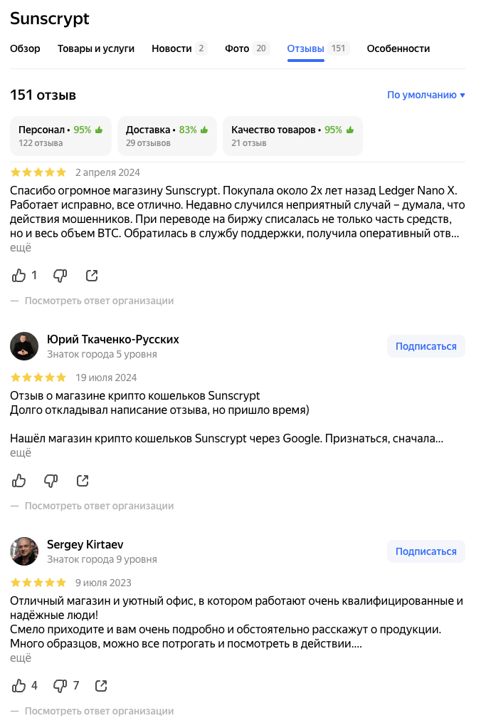 На сайте sunscrypt ru присутствует более 120 положительных отзывов, но они не имеют прямого отношения к обменнику SunCrypt Exchange. Это ревью об интернет-магазине, который продает аппаратные кошельки.