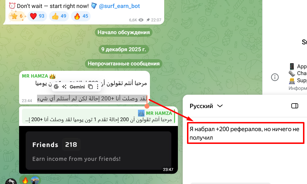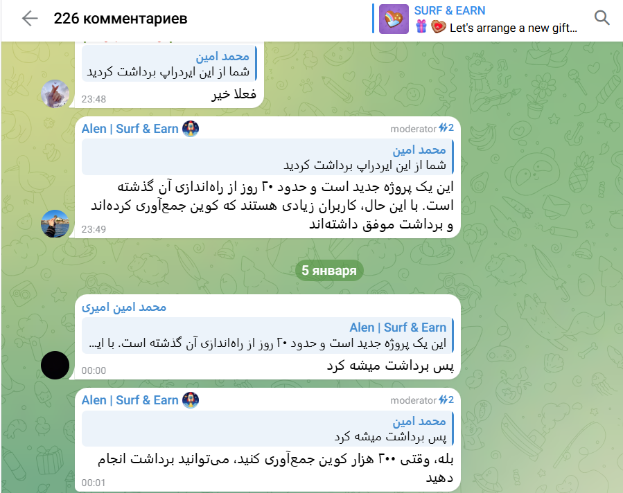 В комментариях на канале нет достоверных откликов от юзеров, которые все же смогли вывести заработанные деньги. А вот некоторые жалобы на фарси мы нашли. Пользователь указывает, что согласно информации в проекте, имея свыше 200 рефералов, он должен получать ежедневный бонус в размере 1 TON. Однако юзер так и не увидел обещанного вознаграждения. Администрация оправдывается – якобы проект новый, бот еще находится в разработке, и пока обещанный заработок выплатить не могут. Что это, если не откровенный обман участников.