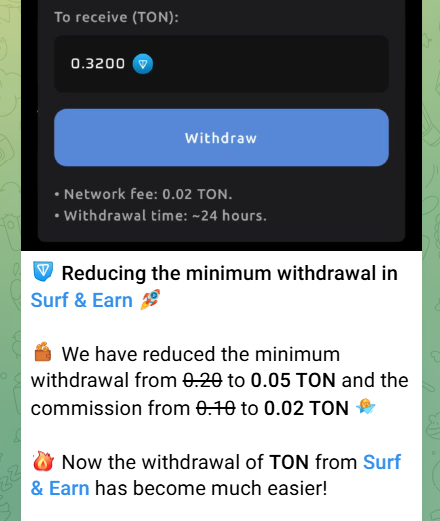 Рекламируемые в приветственном сообщении легкие задания заключаются в просмотре видео на YouTube, переходе по ссылкам на сайты, подписки и квесты. Минималка для вывода на момент написания составляет 0,05 ТОН. С 11 января 2026 года была уменьшена и комиссия – с 0,10 до 0,02 ТОН.