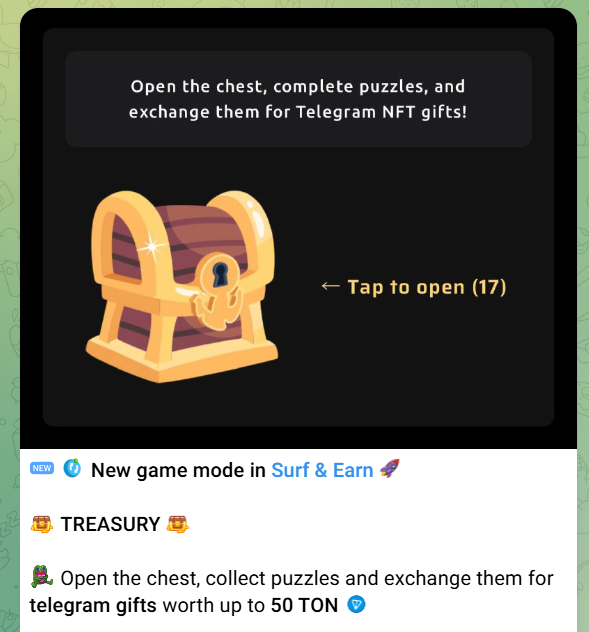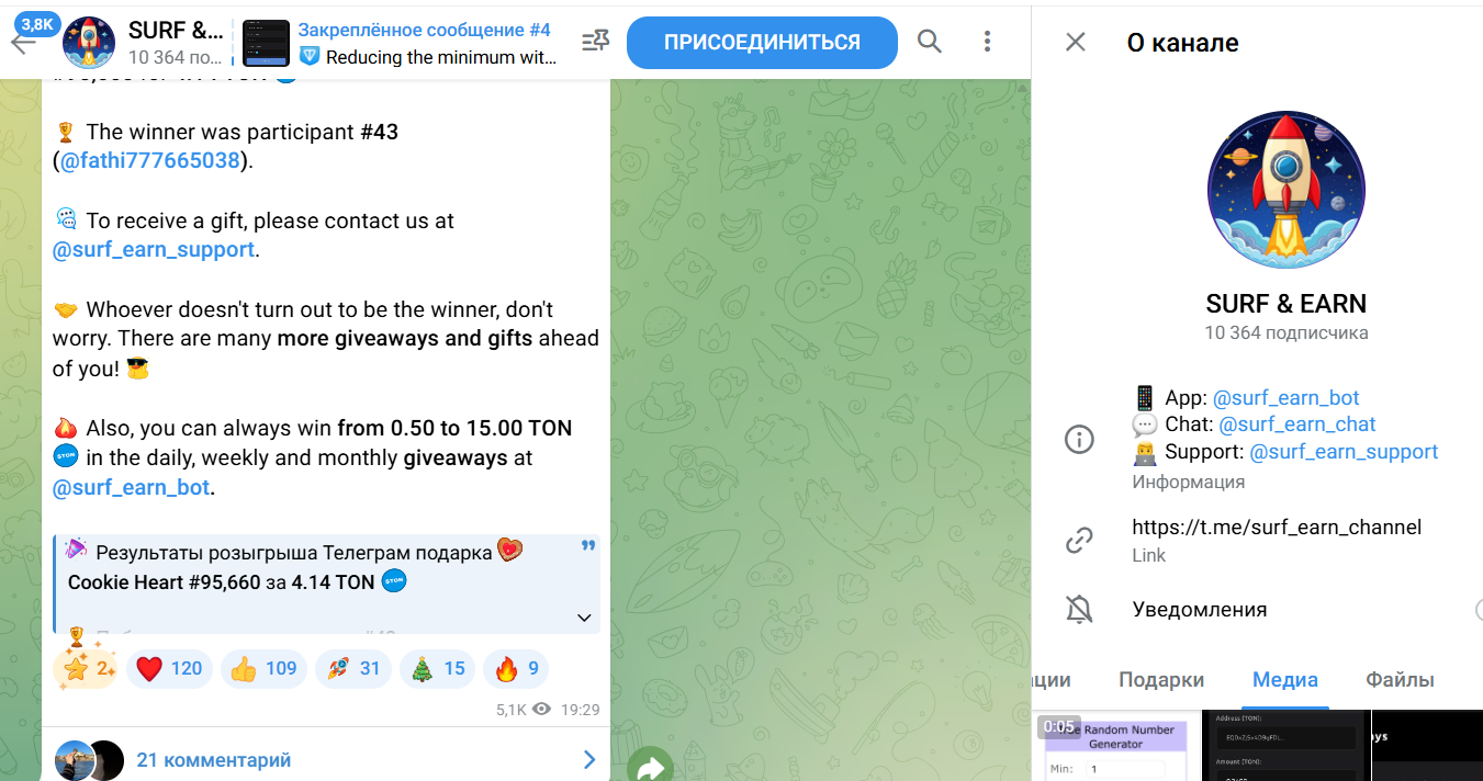 За выполнение некоторых заданий в Серф Еарн, к примеру открытие сундука и пазл, можно получить ТГ-гифты. Как заявляют руководители, ценность Telegram подарков составляет до 50 TON.В боте есть инвестиционные задания. К примеру, пользователь может купить попытки для прокрутки колеса фортуны. На сколько разбогатели юзеры, влив деньги в подобный выигрыш на удачу, в комментариях не отражается.