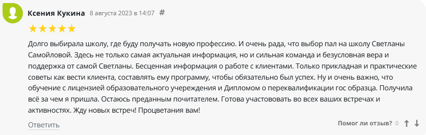 • отзывы об обучении у Самойловой только положительные, жалоб на деятельность школы найти не удалось.