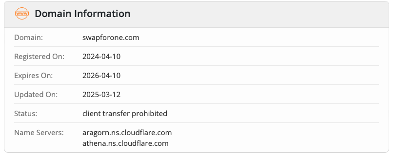 Все это выглядит весьма странно. Внизу главной страницы нет привычной информации о самой компании, даже минимальной. Никакие контакты тоже не указаны. Кроме того, даже кнопки для переключения между типами активов в обменнике не работают. Можно пользоваться только вкладкой «ALL». Вообще отзывы о swapforone com (именно о работе сайта) крайне негативные. Создается ощущение, что сайт делали максимально бюджетно наспех.Проверка домена Swap for one com указывает на то, что сайт запущен в 2024 году.