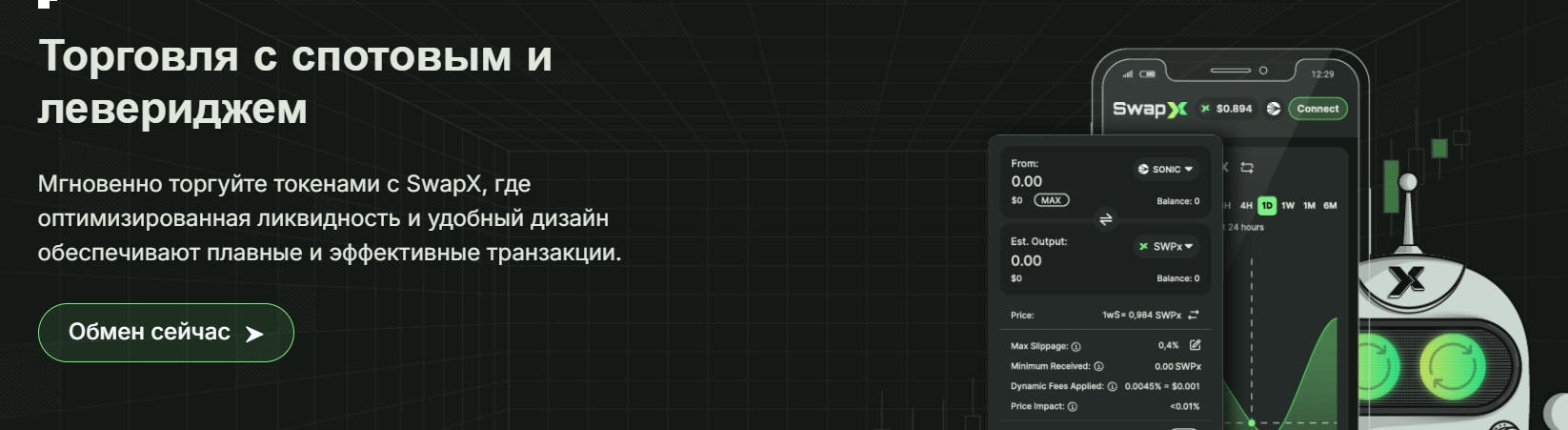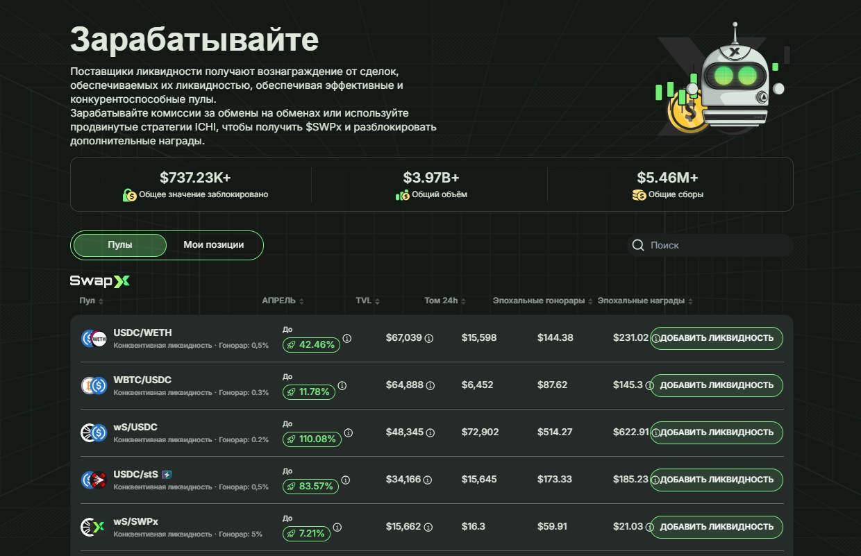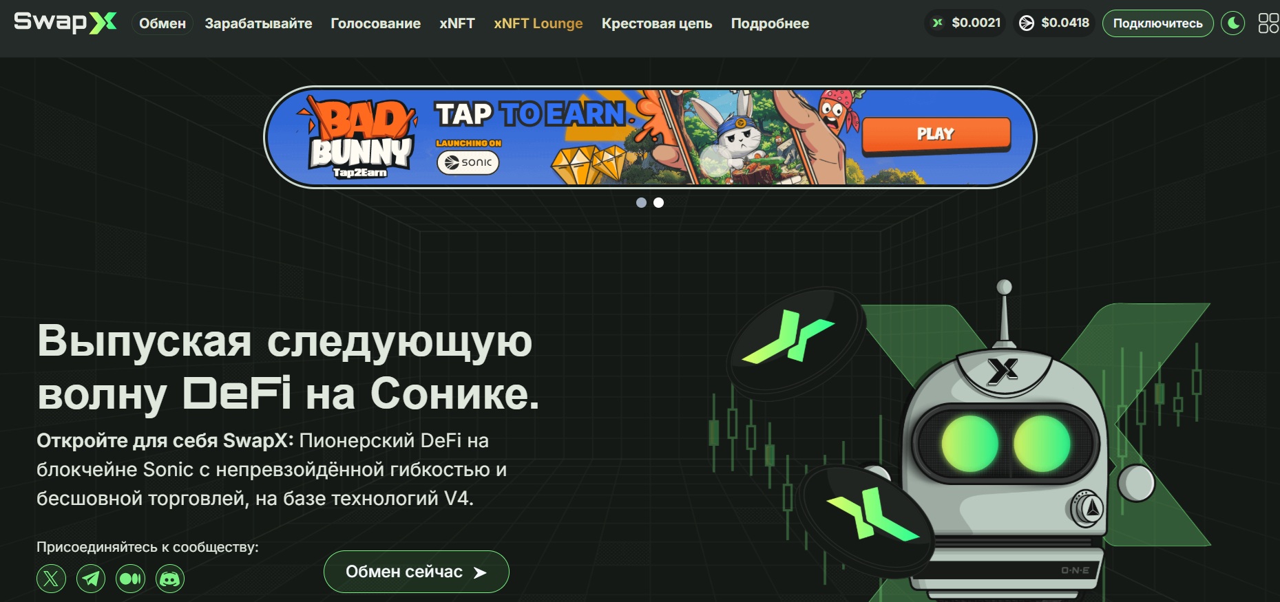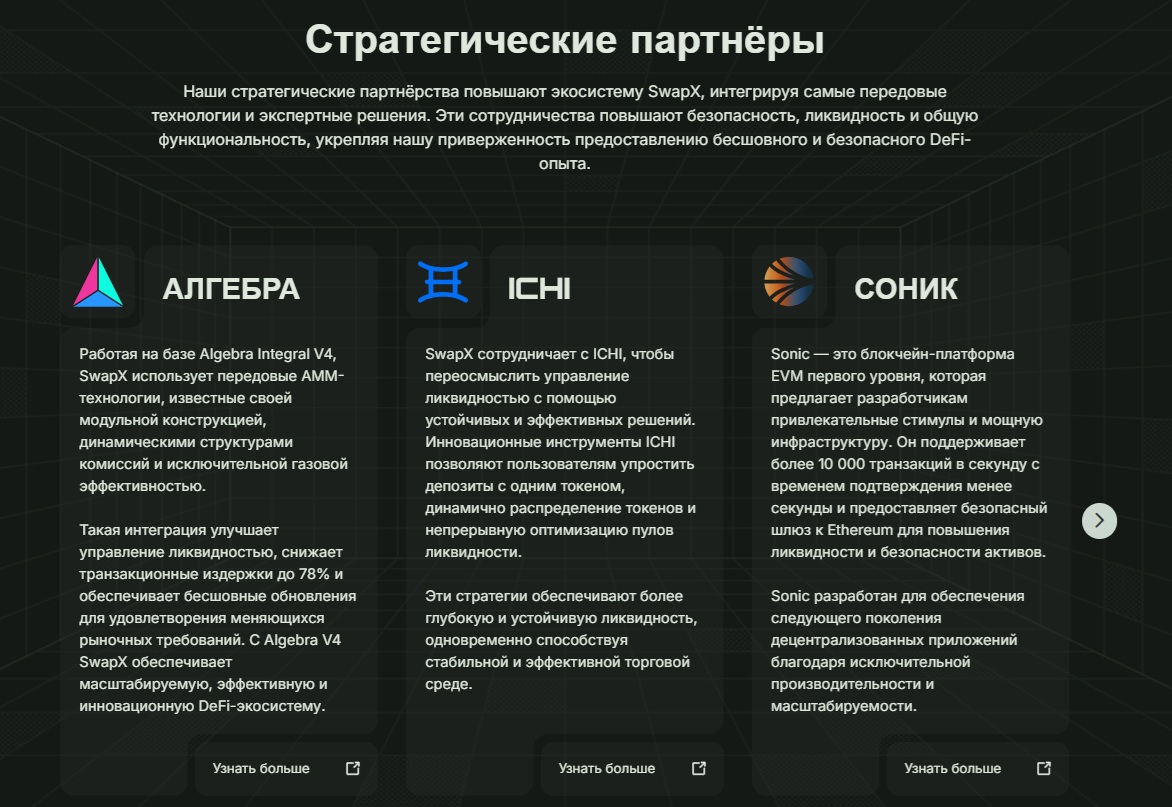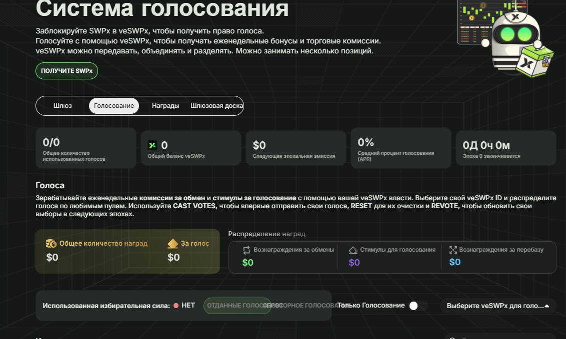 Swapx позиционирует себя как децентрализованную криптоплатформу на блокчейне Sonic. Проект специализируется на обмене активов, ликвидности и механизмах заработка через NFT и голосования. Здесь нет трейдинга в классическом понимании, но есть элементы DeFi и геймификации.