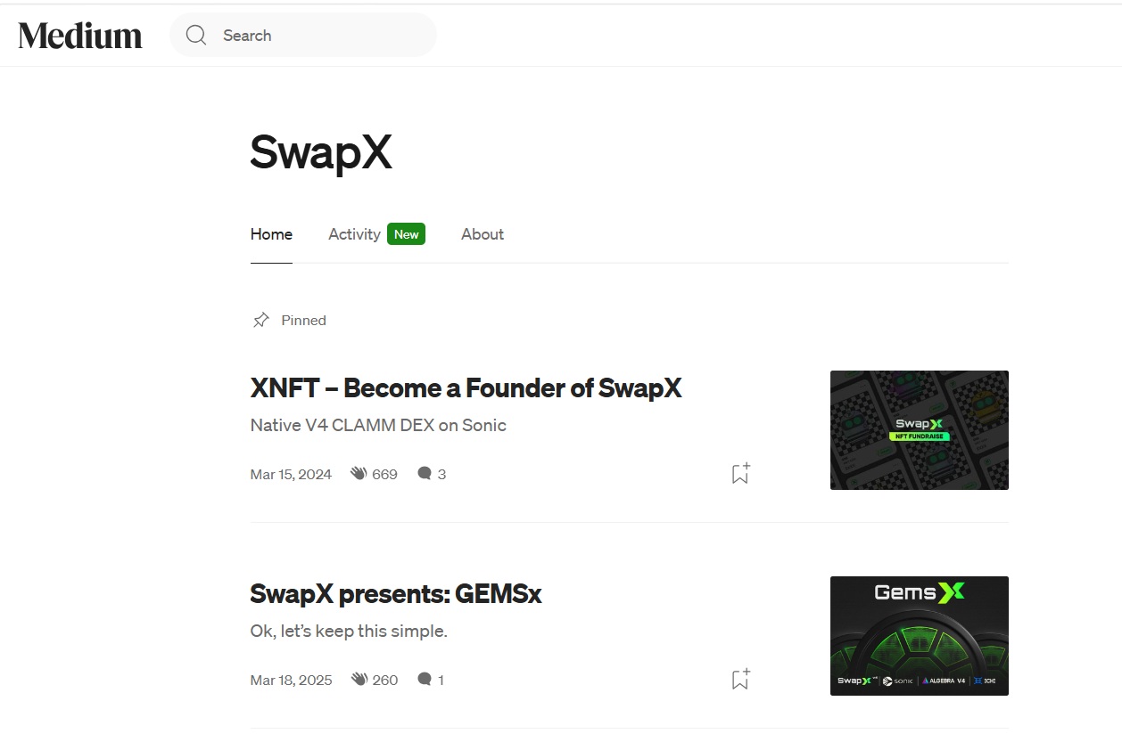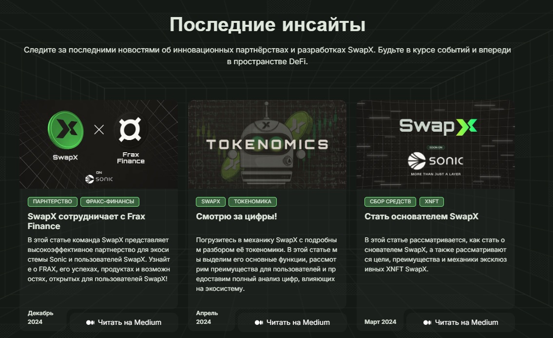 На данный момент Swap X ведёт сразу несколько направлений. Это обменник, система для голосования, зона с xNFT и кроссчейн-функции. Проект активно продвигается через Twitter, Telegram, Medium и Discord. Судя по публикациям, платформа делает ставку на партнёрства с такими проектами, как Frax Finance, Algebra и ICHI. Официальные анонсы выходят с конца 2024 года, что говорит о молодом возрасте проекта.