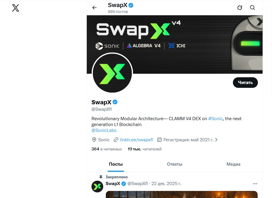 Twitter-аккаунт Swapx зарегистрирован в мае 2021 года, что расходится с датой создания домена. У профиля 19 тысяч читателей, но посты набирают минимальное количество лайков и ретвитов. Такое соотношение подписчиков и вовлечённости выглядит неестественно и может указывать на накрутку. Публикации носят новостной и партнёрский характер, живого общения с подписчиками практически нет.