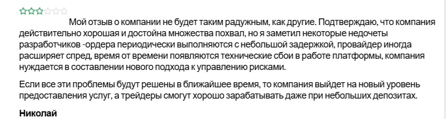 Пользователь Николай указал на задержки при выполнении ордеров, расширение спреда и технические сбои. По его мнению, компании не хватает нового подхода к управлению рисками.