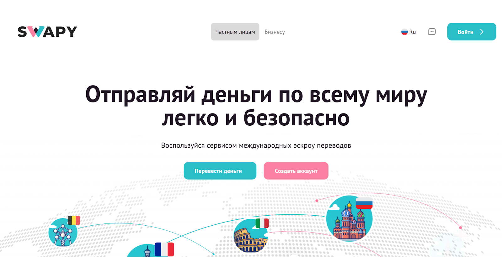 Официальный сайт Swapy представлен на двух языках —- русском и английском. В верхнем меню клиентам сразу предлагают выбрать оптимальный раздел — для частных лиц или бизнеса. В основной части приводится описание особенностей и плюсов проекта.