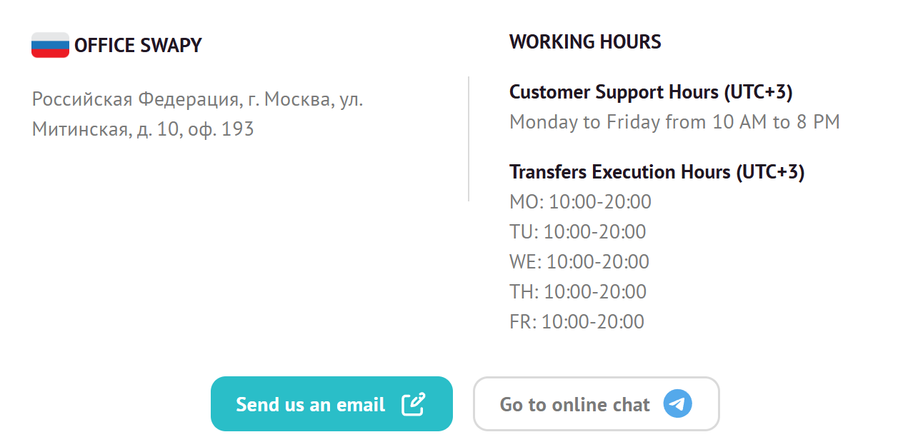 Сведения о лицензии найти не удалось. Также представители SwapyOne ничего не рассказывают о команде и истории развития. Связь с поддержкой работает через специальную форму, электронную почту или онлайн-чат. В качестве официального адреса указывается Москва. Офис находится на ул. Митинская, д. 10, оф. 193.