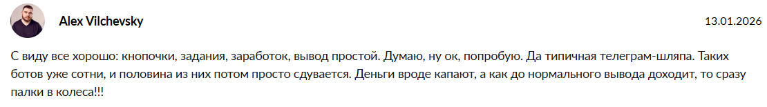 Те, кто пытались пользоваться ботом отмечают, что деньги за задания в боте якобы перечисляются, но когда доходит до вывода – получить их нельзя. Проект сравнивают с множеством других телеграмм-ботов, созданных для обмана.