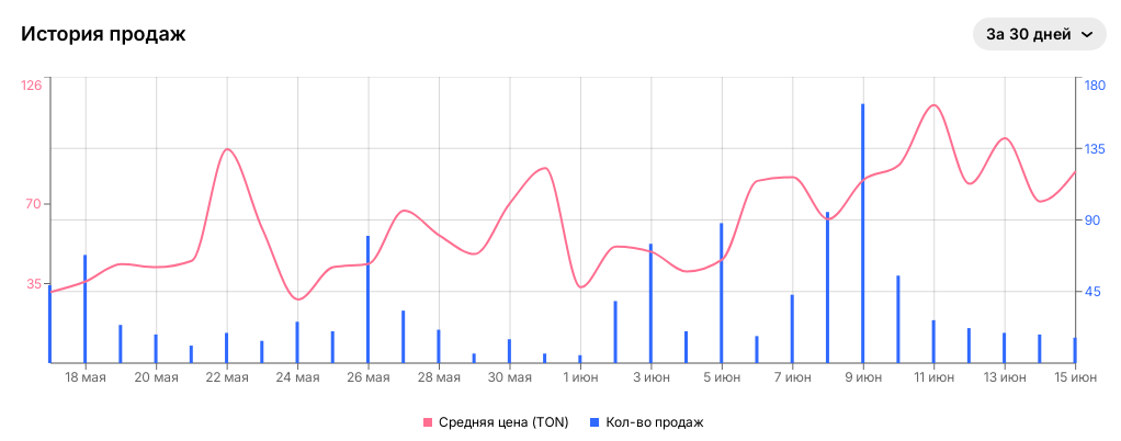 Судя по статистике маркетплейса, НФТ часы пользуются успехом в Телеграмм. Почти каждый день продаются десятки штук, месячный объем торгов приближается к 100 тыс.TON.
