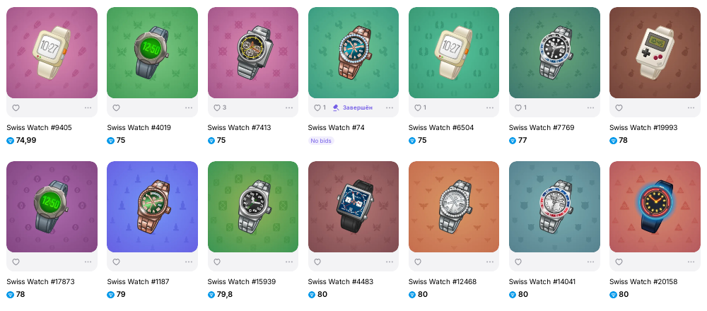 В маркетплейсе можно отсортировать Swiss Watch NFT по цене. Например, самые дешевые экземпляры обойдутся от 20 до 60 TON.