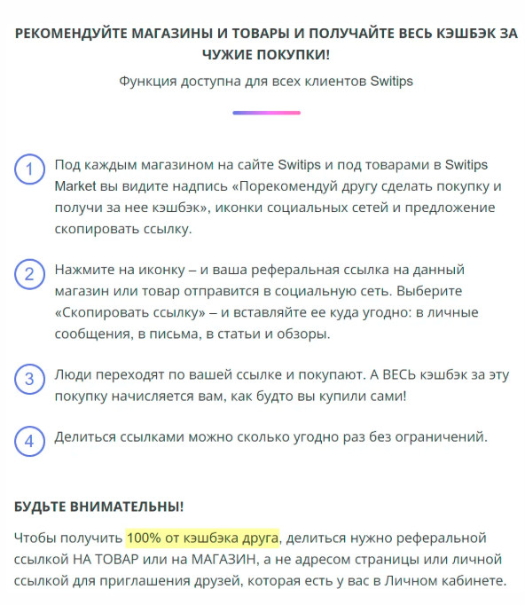 Switips – сервис, основанный на простой системе получения дохода, в которой клиент покупает товары, получает часть денег обратно и может заработать еще больше, если приведет знакомых. Проект подается как площадка с тысячами магазинов, приложением, бонусами и кэшбэком 40%.