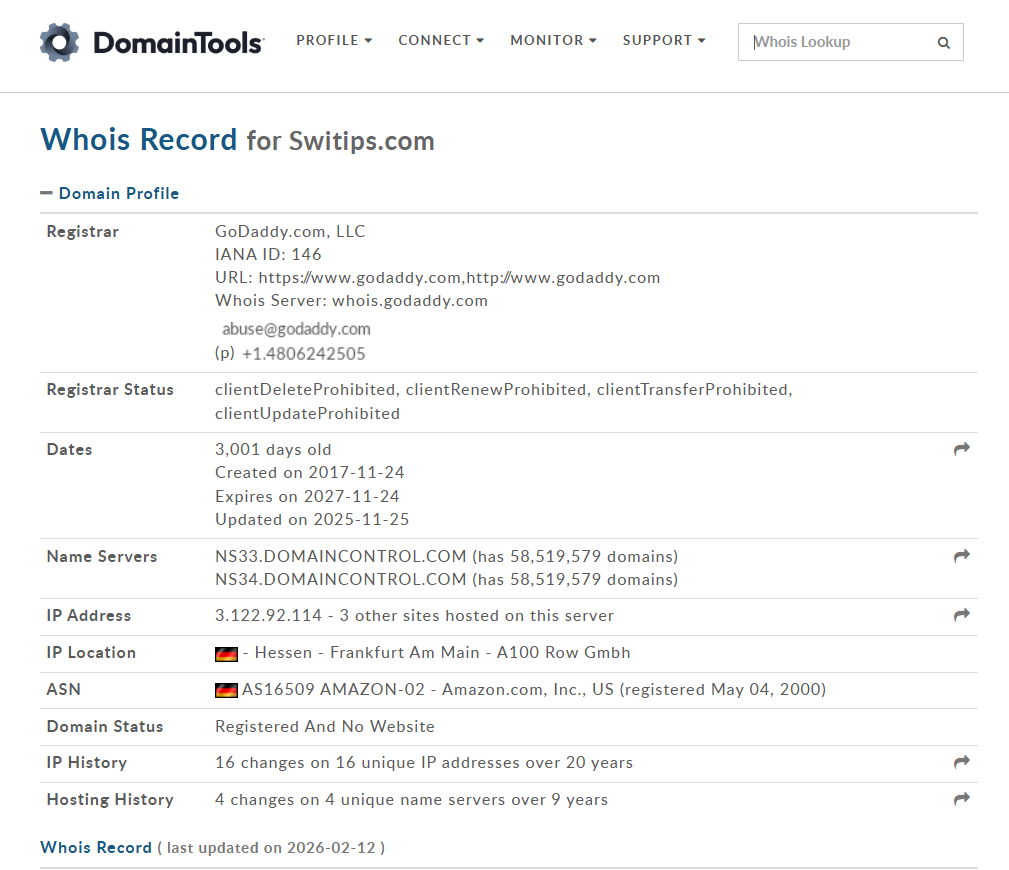По данным Whois сайт «Свитипс» появился в ноябре 2017 года. Владелец и компания скрыты, а за года существования он часто менял IP адреса. Архивы подтверждают, что сайт существовал, наполнялся и какое-то время активно развивался.