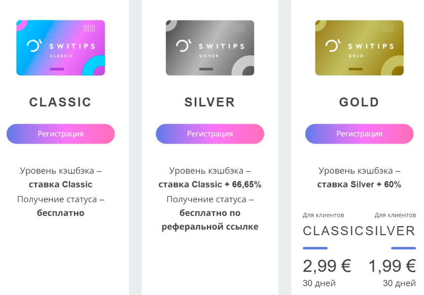 Клиентам предлагали три пакета или уровня участия – Classic, Silver и Gold. Базовый классический открывался бесплатно, а Silver только по приглашению. Gold стоил от €1,99 до €2,99 за 30 дней или включался после того, как клиент накопил достаточно кэшбэка.