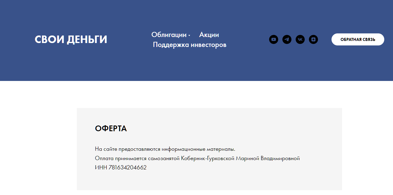 На своем сайте Марина Коберник-Гурковская указала информацию о себе, а точнее номер ИНН, зарегистрированного самозанятым лицом. Однако на сайте ФНС данных нет. Да и странно, что у опытного инвестора, продвигающего платные услуги, оформлена только самозанятость. Напоминаем, что самозанятый может получать до 2,4 миллиона рублей в год.