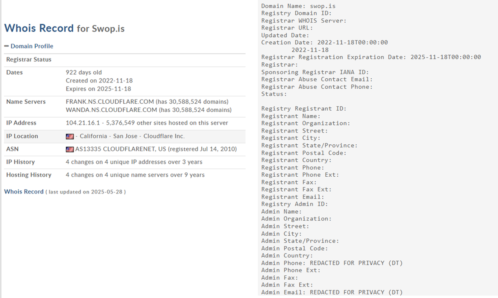Проекту 2,5 года, домен был зарегистрирован в ноябре 2022 и скрывает всю информацию о владельце. Отсутствует прозрачная юридическая база. Неясно, где зарегистрирован сервис, какой юрисдикции подчиняется, и что делать, если что-то пойдет не так.