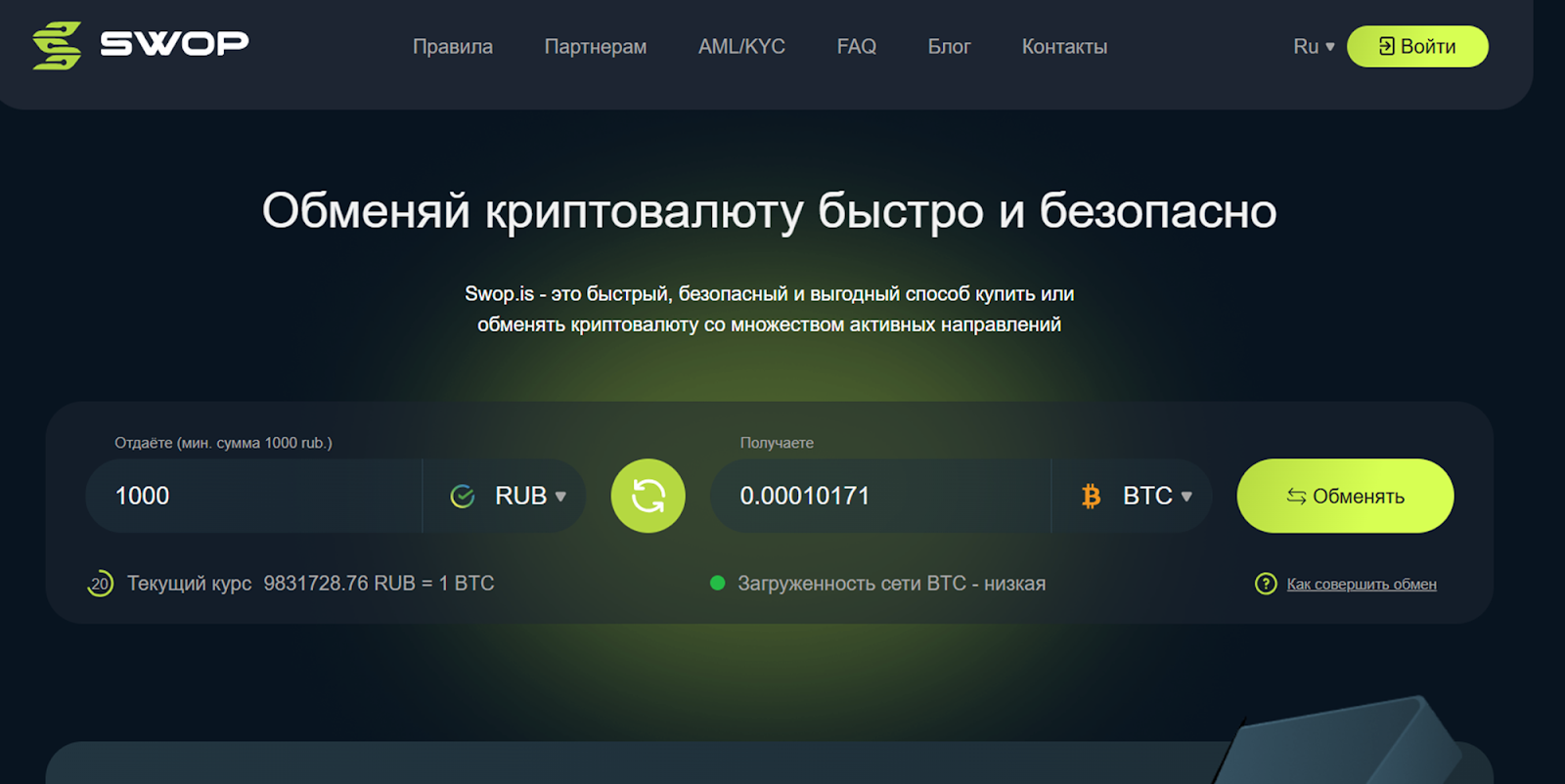 Swop is подает себя как “обменник нового поколения”: красивый интерфейс, тысячи направлений, круглосуточная работа, поддержка популярных банков России и Казахстана, с AML-проверкой. В теории все на уровне, а на практике как-то мутновато.