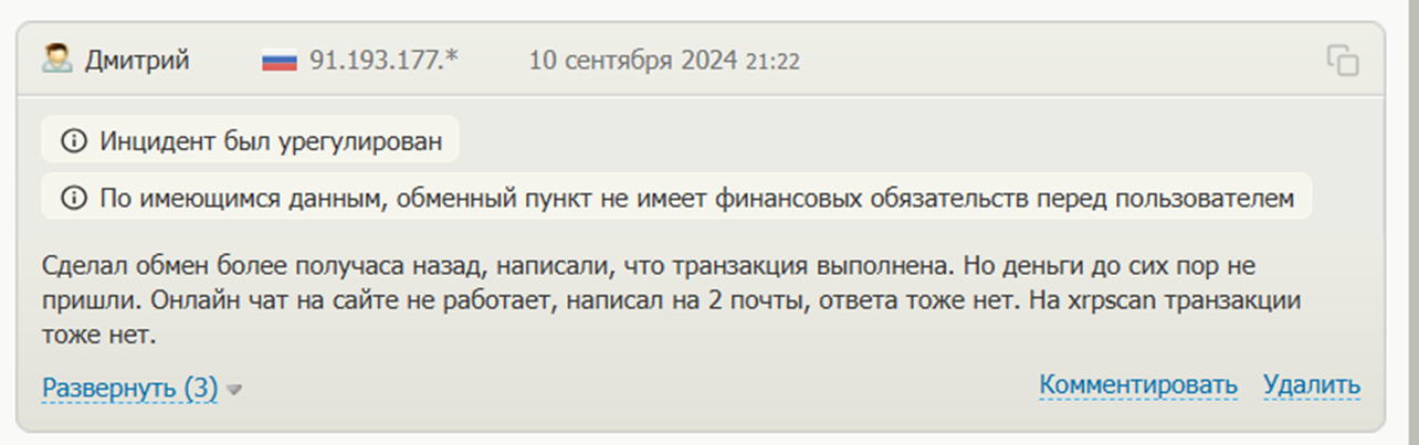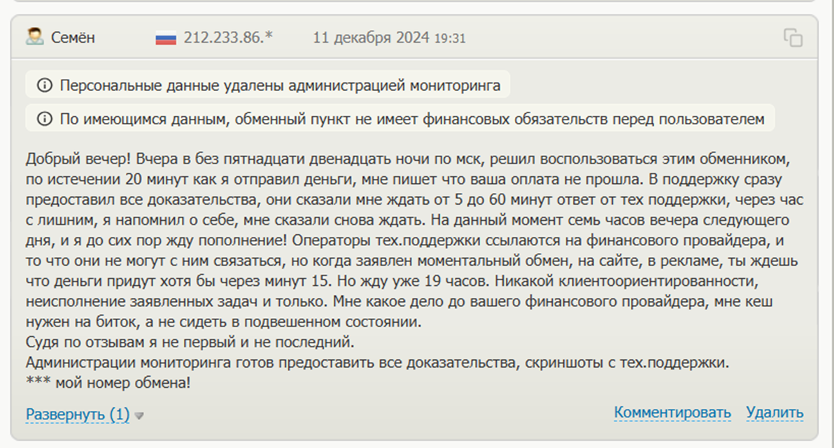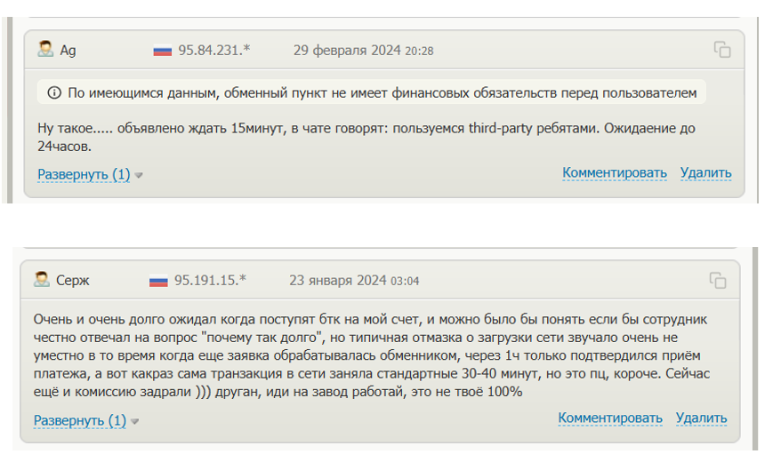 Одни описывает ситуацию, что их кинули: деньги ушли, но обмен не состоялся, другие, что моментальный обмен превратился в многодневное ожидание.