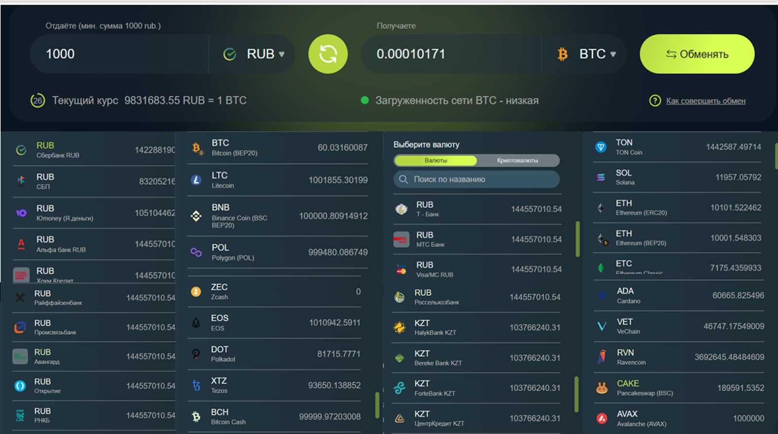 Доступно +3К направлений обмена 24/7, вывод на банковские карты как России (Сбер, Тиньк, ВТБ и др.), так и Казахстана (Каспи, Форте и т.д.).