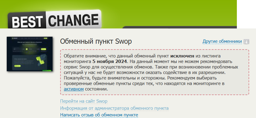 Копнув глубже мы обнаружили след swop обменник на Beschange. Как оказалось, проект был представлен ранее у мониторинга, но в ноябре 2024 г. был исключен из листинга c рекомендацией использовать проверенные обменники.
