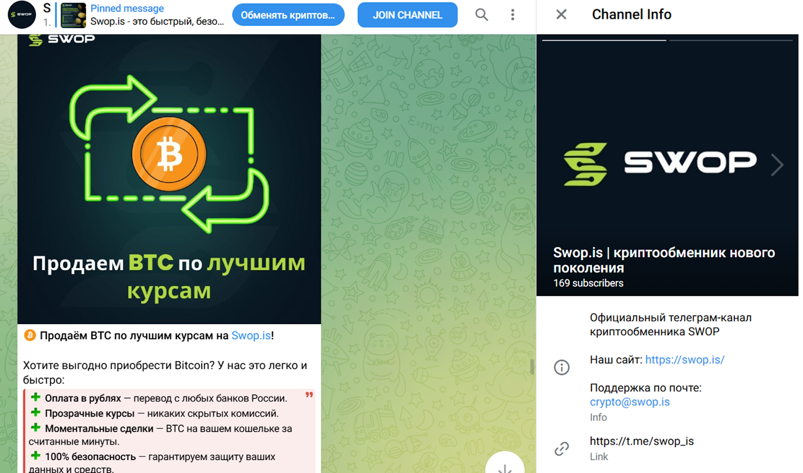 Также существует канал в телеграм под названием Swop is крипто обменник нового поколения. Хотя паблик не кричит об этом прямо, очевидно, что доход идет от маржи на курсе. Курс чуть менее выгоден, чем на бирже, но вы платите за удобство и скорость.
